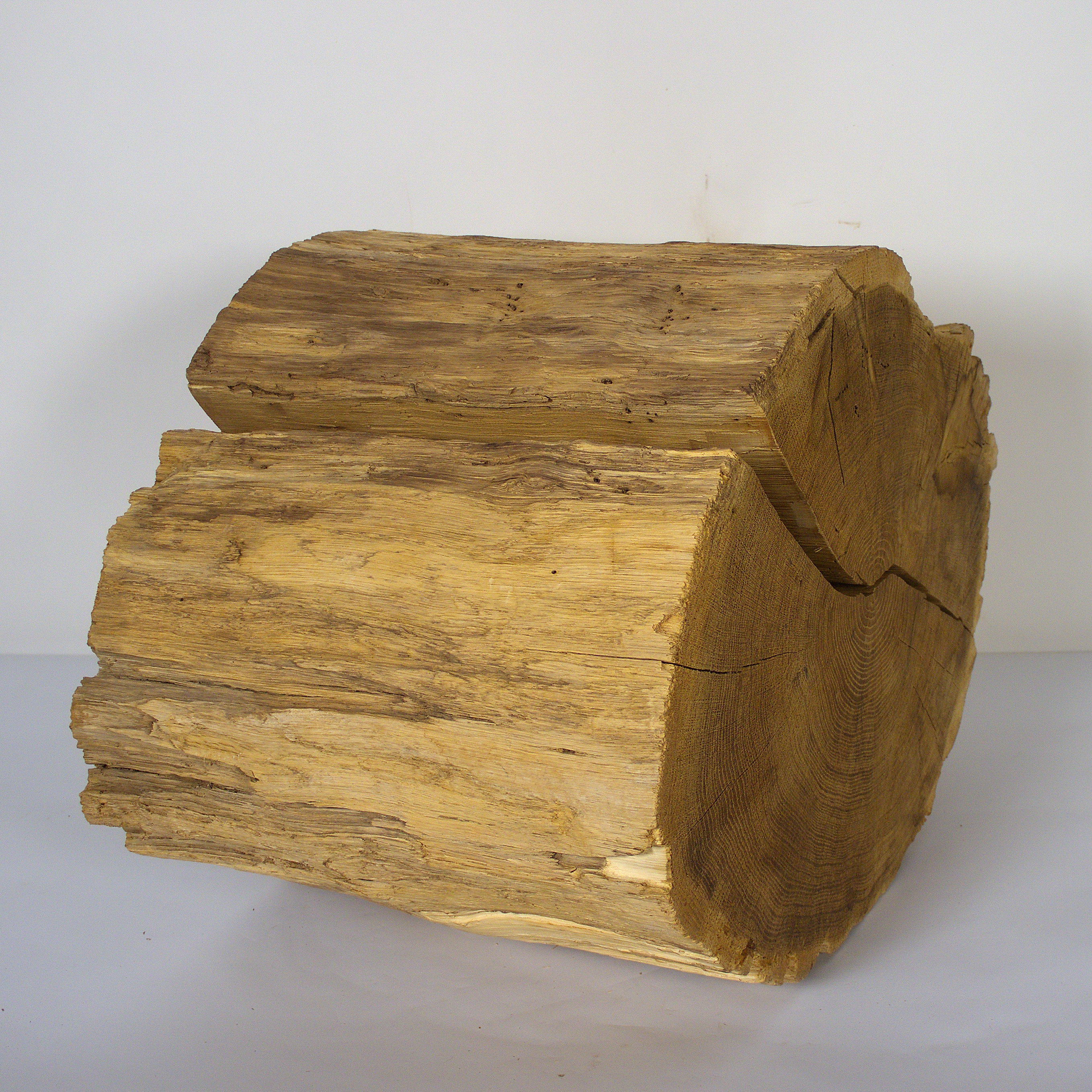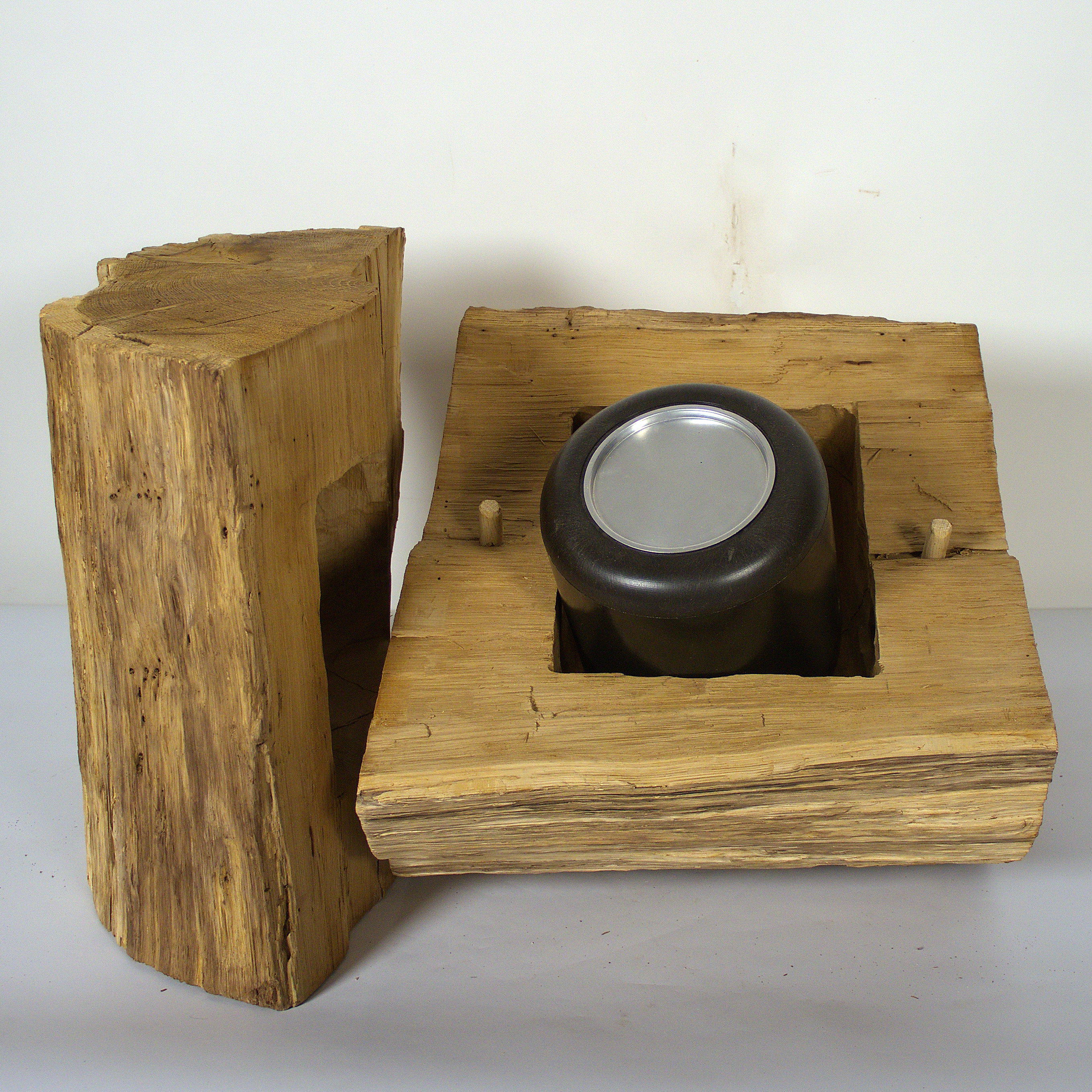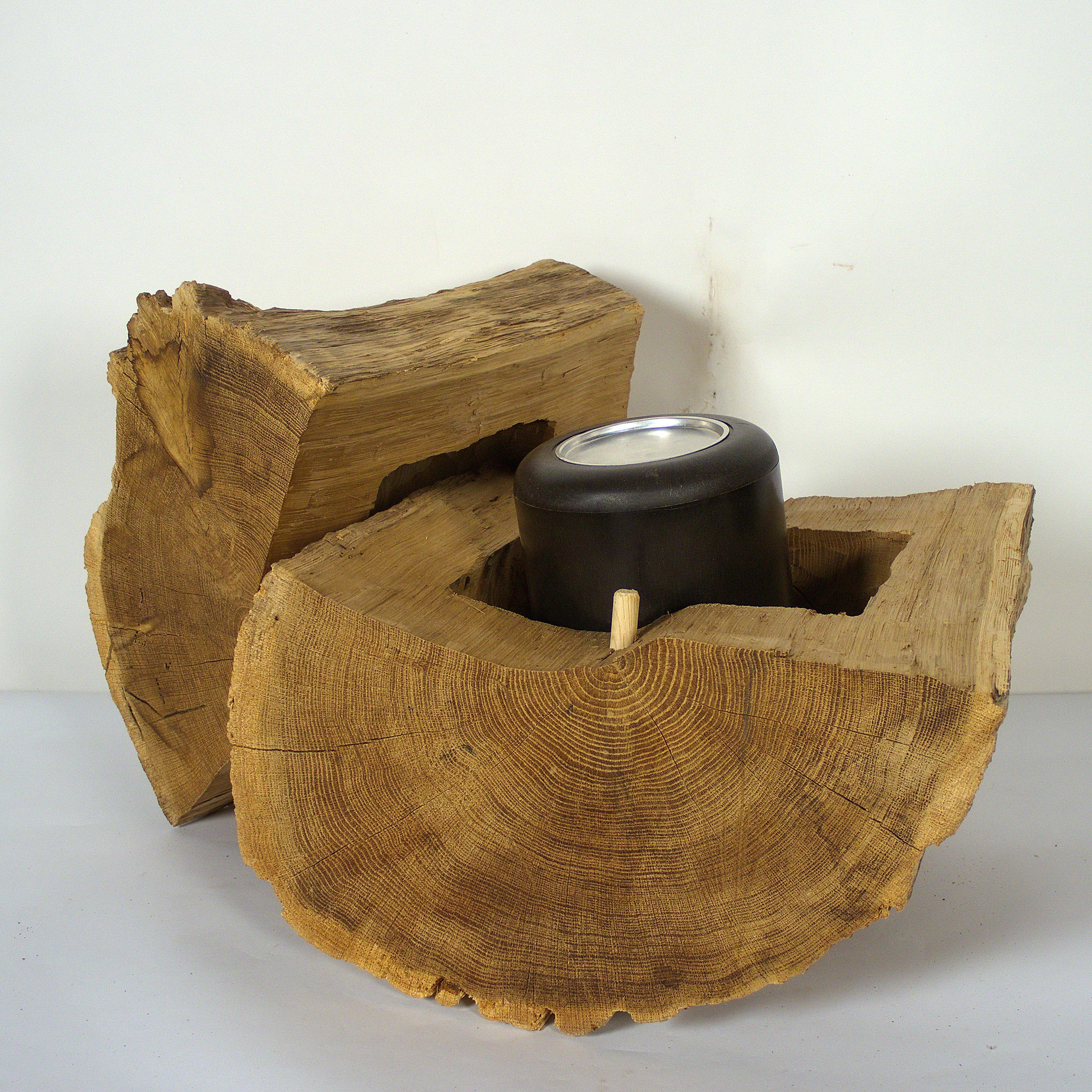 Dieses Objekt ist gedacht zum Aufbewahren einer Urnenkapsel zu Hause. Der Abschnitt eines Eichenstammes, geteilt in zwei Hälften, wirkt als Skulptur oder Körper. Die Maße: 41 x 54 x 37 cm, die Holzoberfläche ist gebürstet und naturbelassen.
