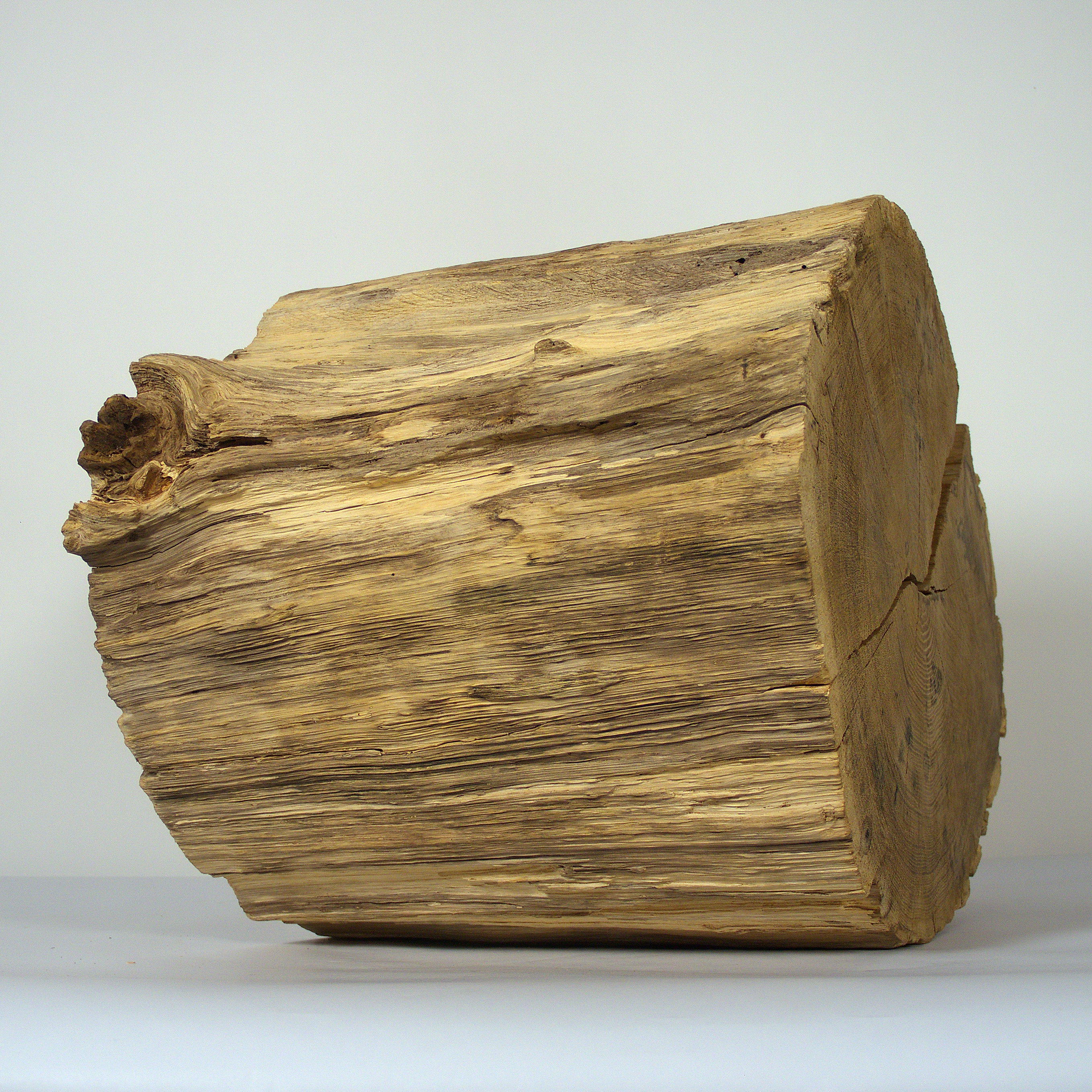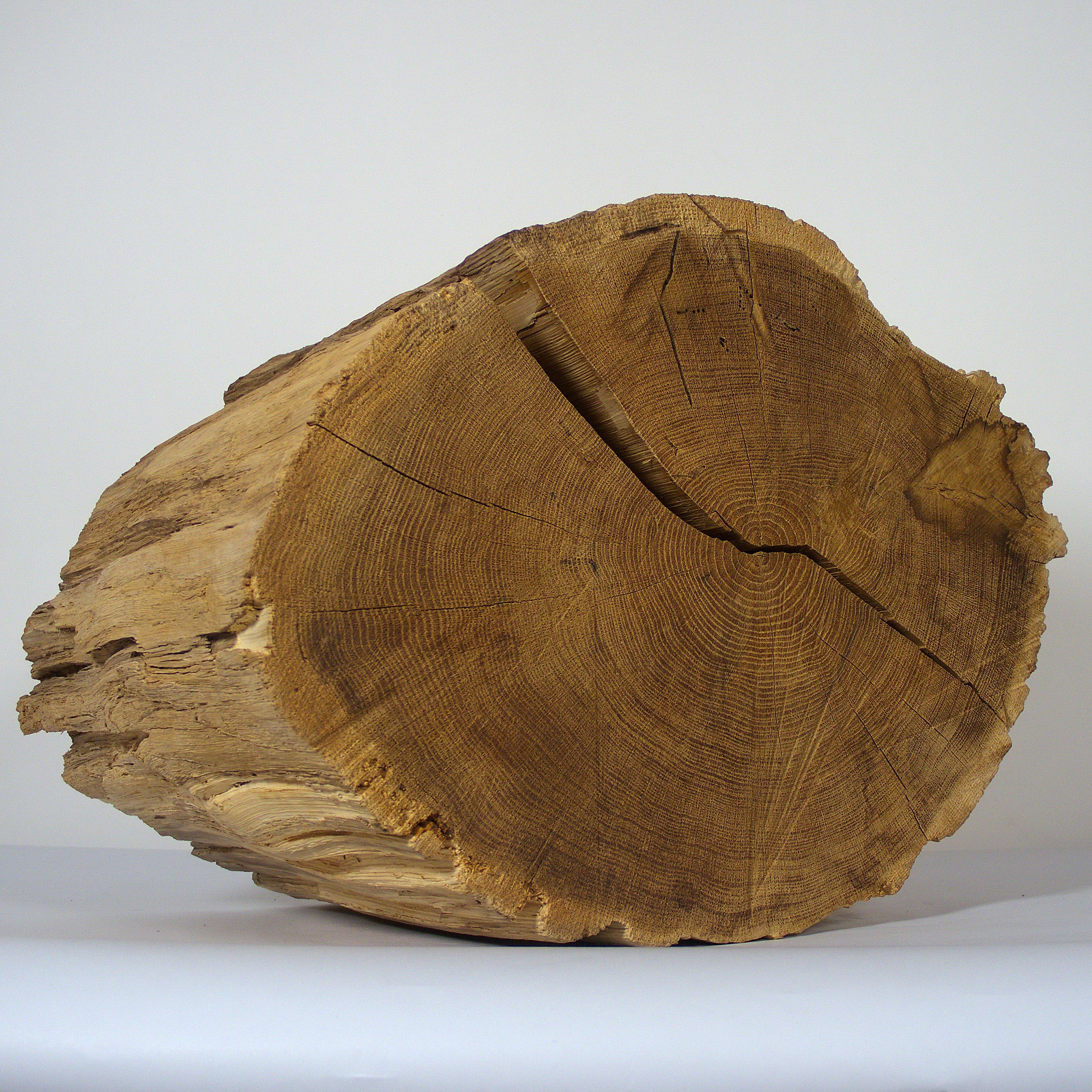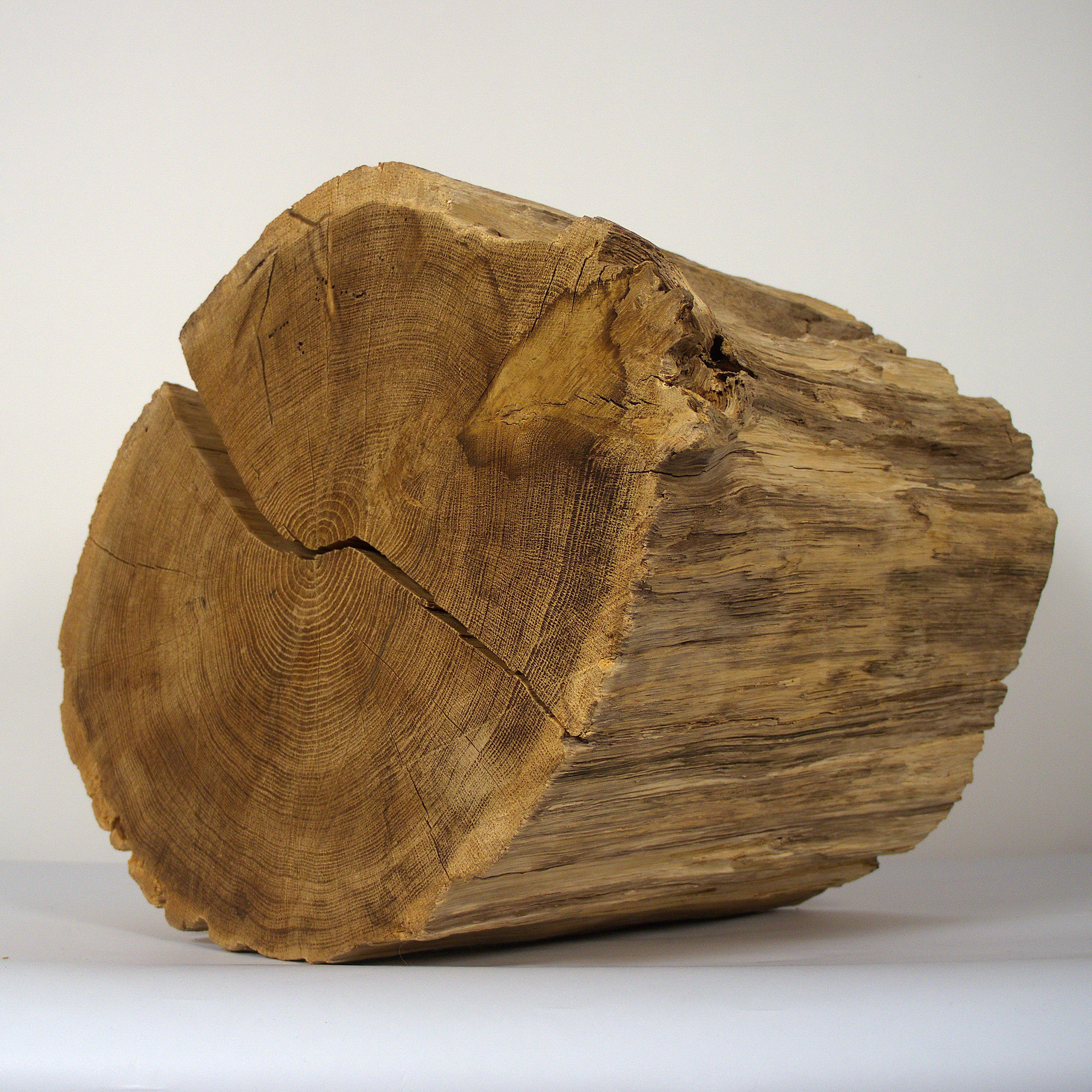 Dieses Objekt ist gedacht zum Aufbewahren einer Urnenkapsel zu Hause. Der Abschnitt eines Eichenstammes, geteilt in zwei Hälften, wirkt als Skulptur oder Körper. Die Maße: 41 x 54 x 37 cm, die Holzoberfläche ist gebürstet und naturbelassen.