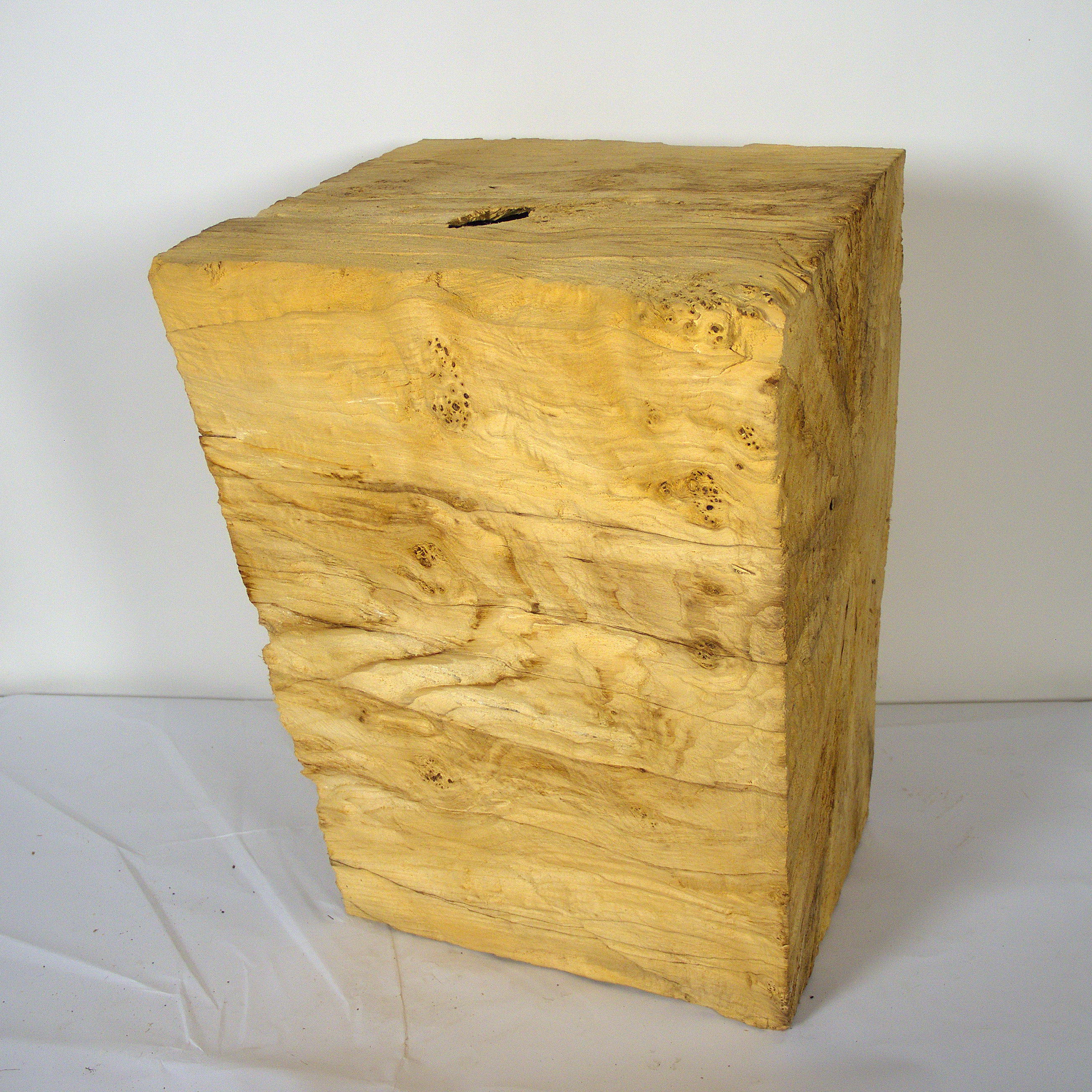 Aus dem Holz einer Pappel habe ich diesen kubischen, hohlen Körper gearbeitet. Diese geometrischen Körper arbeite ich frei Auge, sodaß ich eine Annäherung an einen exakt geformten Körper erhalte. Die Holzoberfläche ist anschließend gebürstet. Maße: 61x42x45 cm