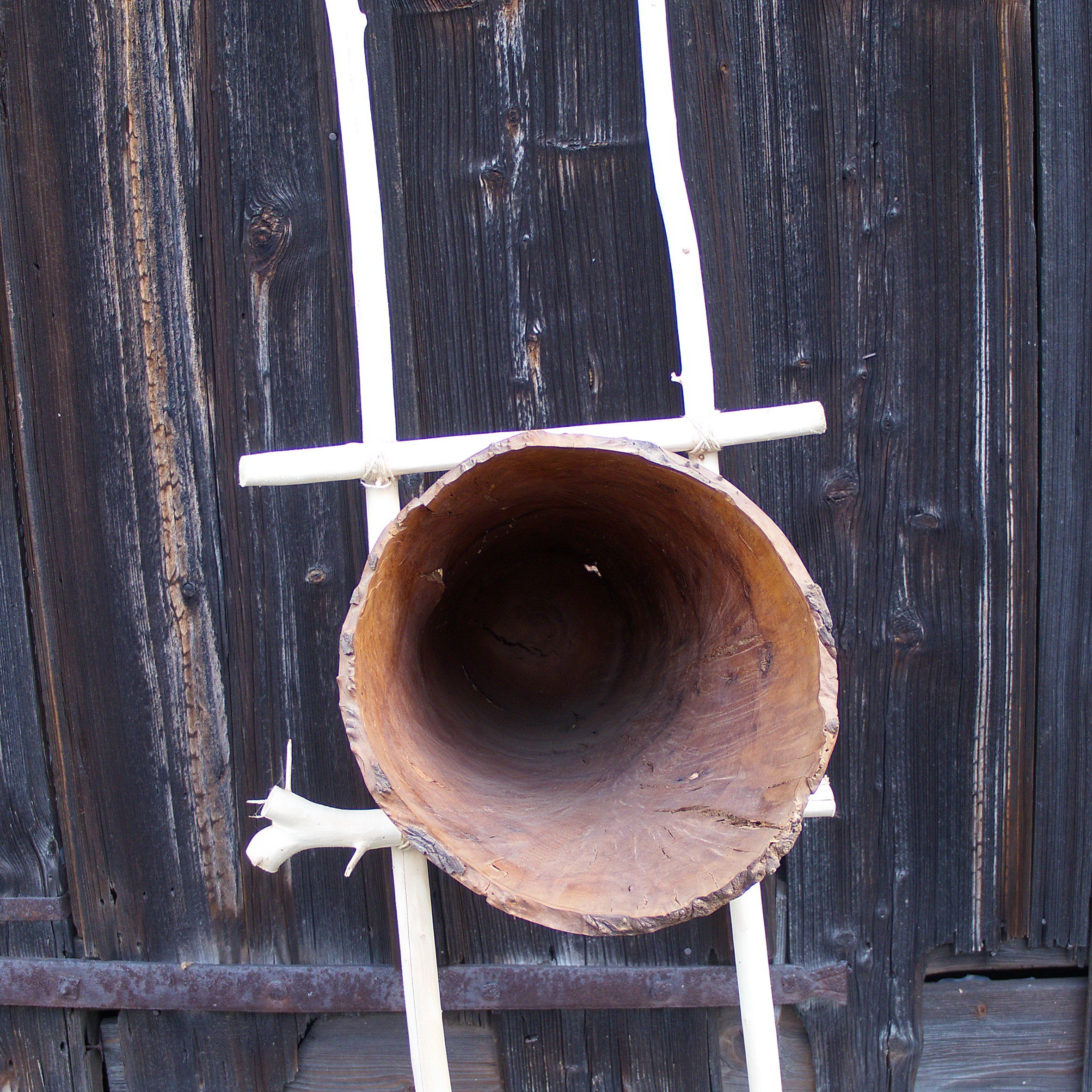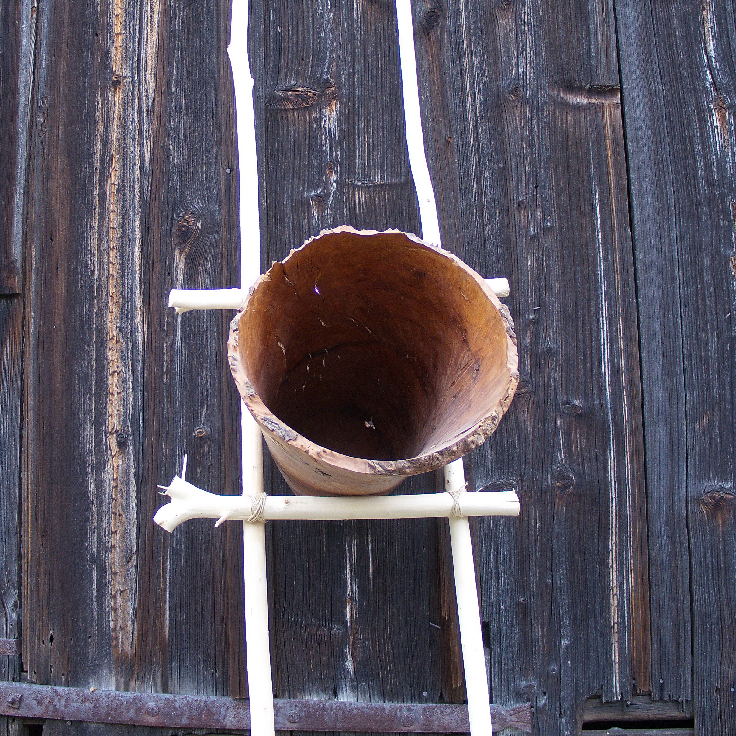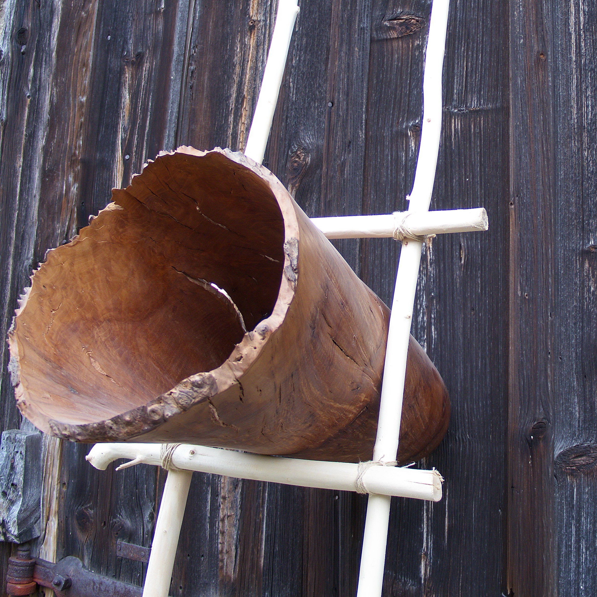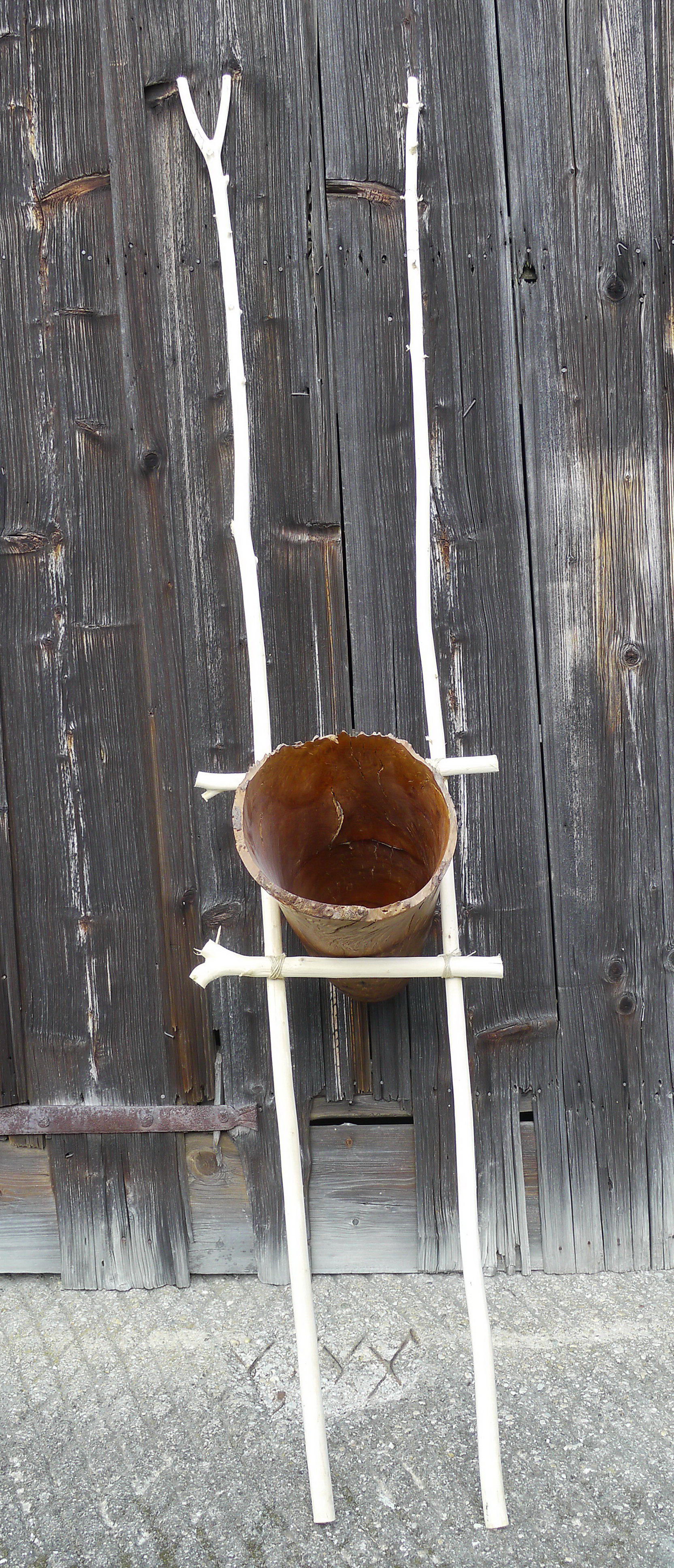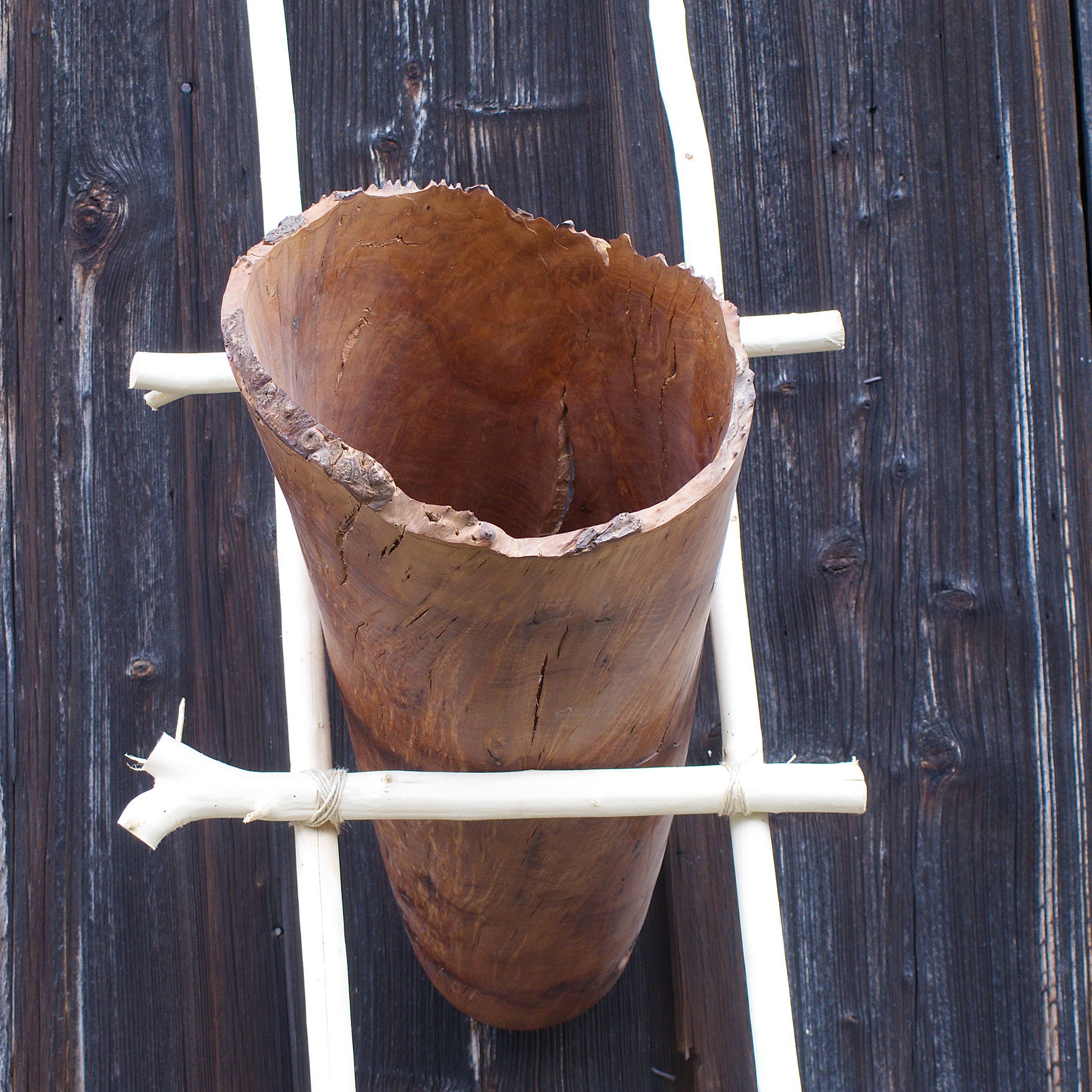 Diese Skulptur ist gedacht, sie an die Wand zu lehnen. Die Gefäßform habe ich aus Madrona Maserholz gearbeitet, die zusammengebundenen Äste sind aus Weide. Die Maße des Gefäßes: Dm 30 cm, L 75 cm, die Holzoberfläche ist gewachst.