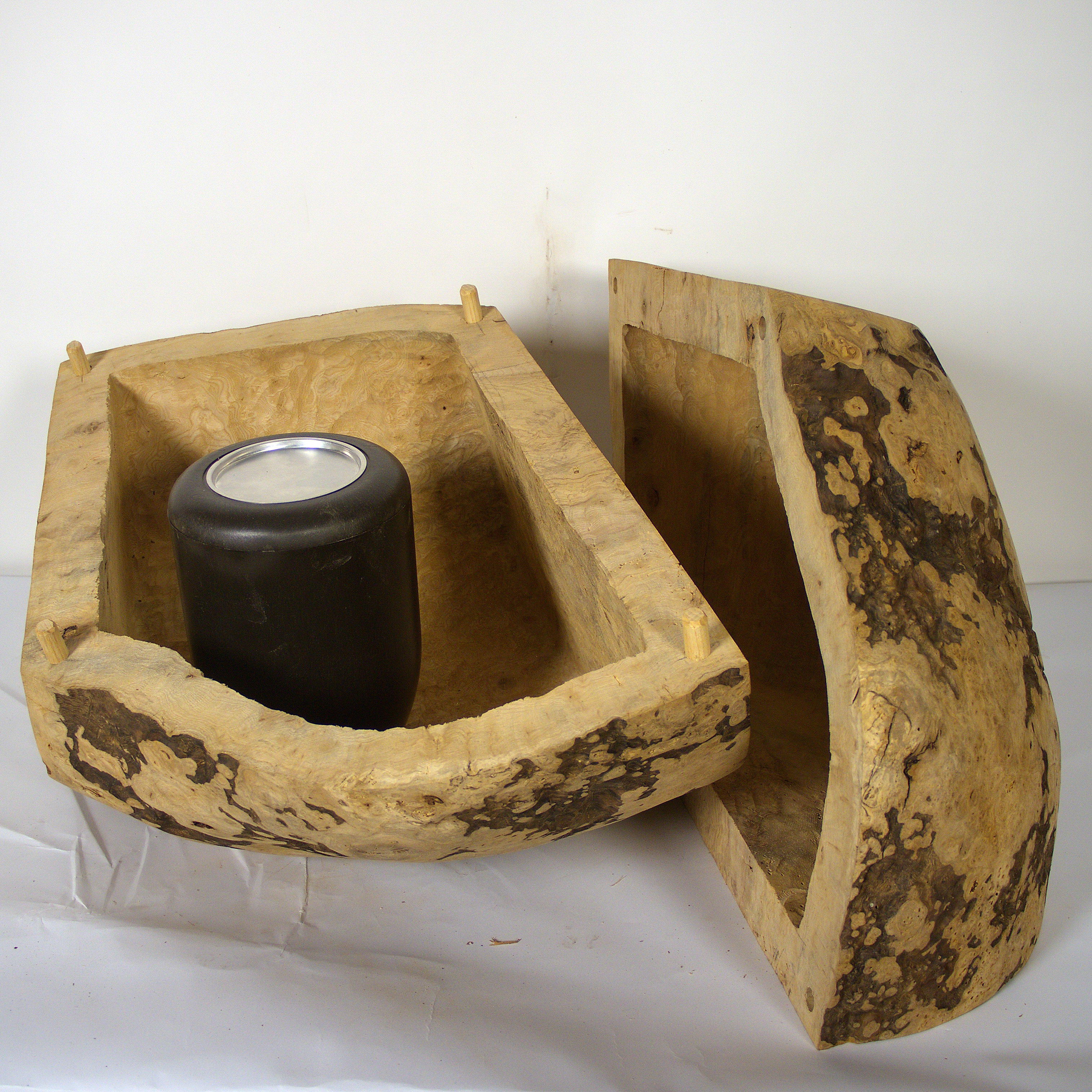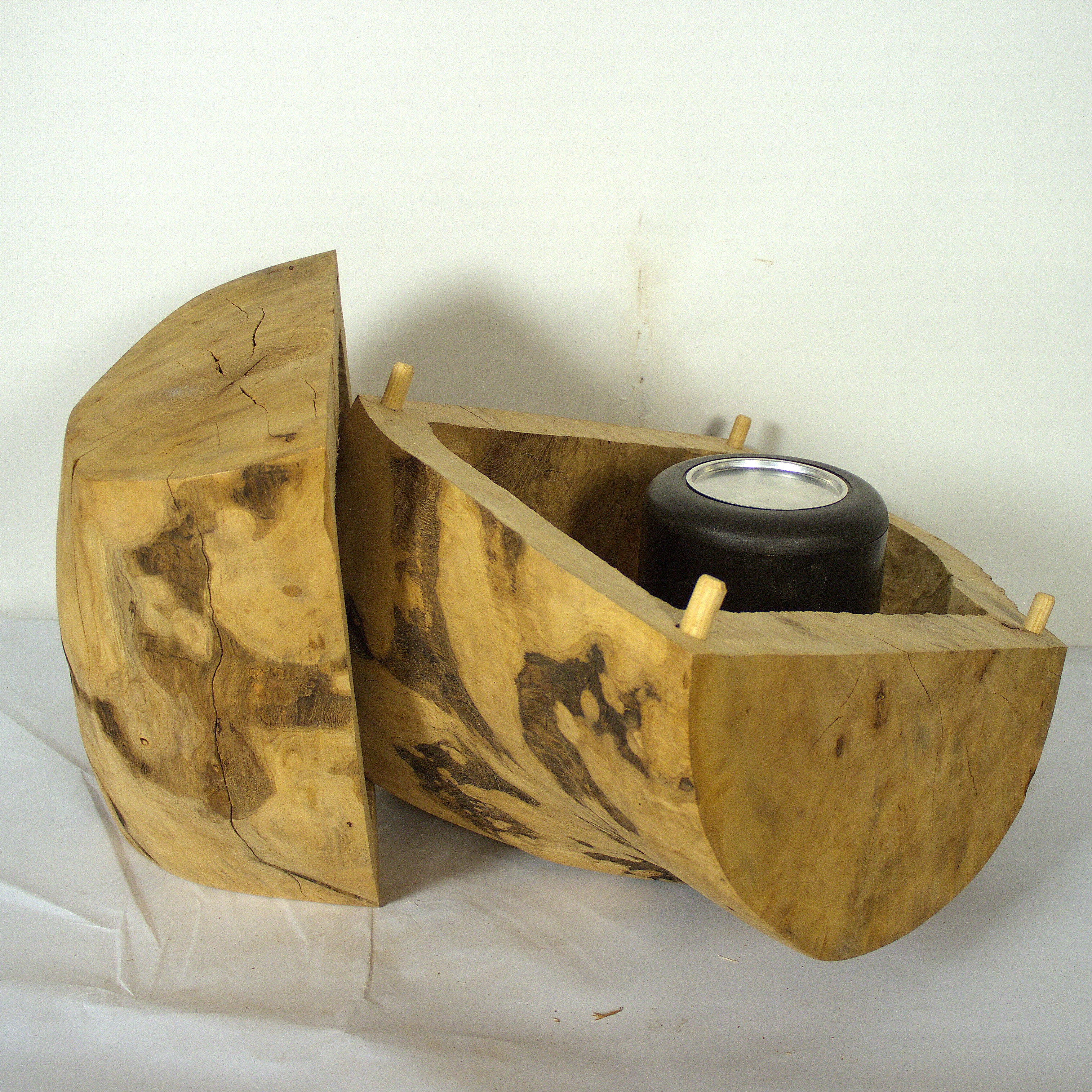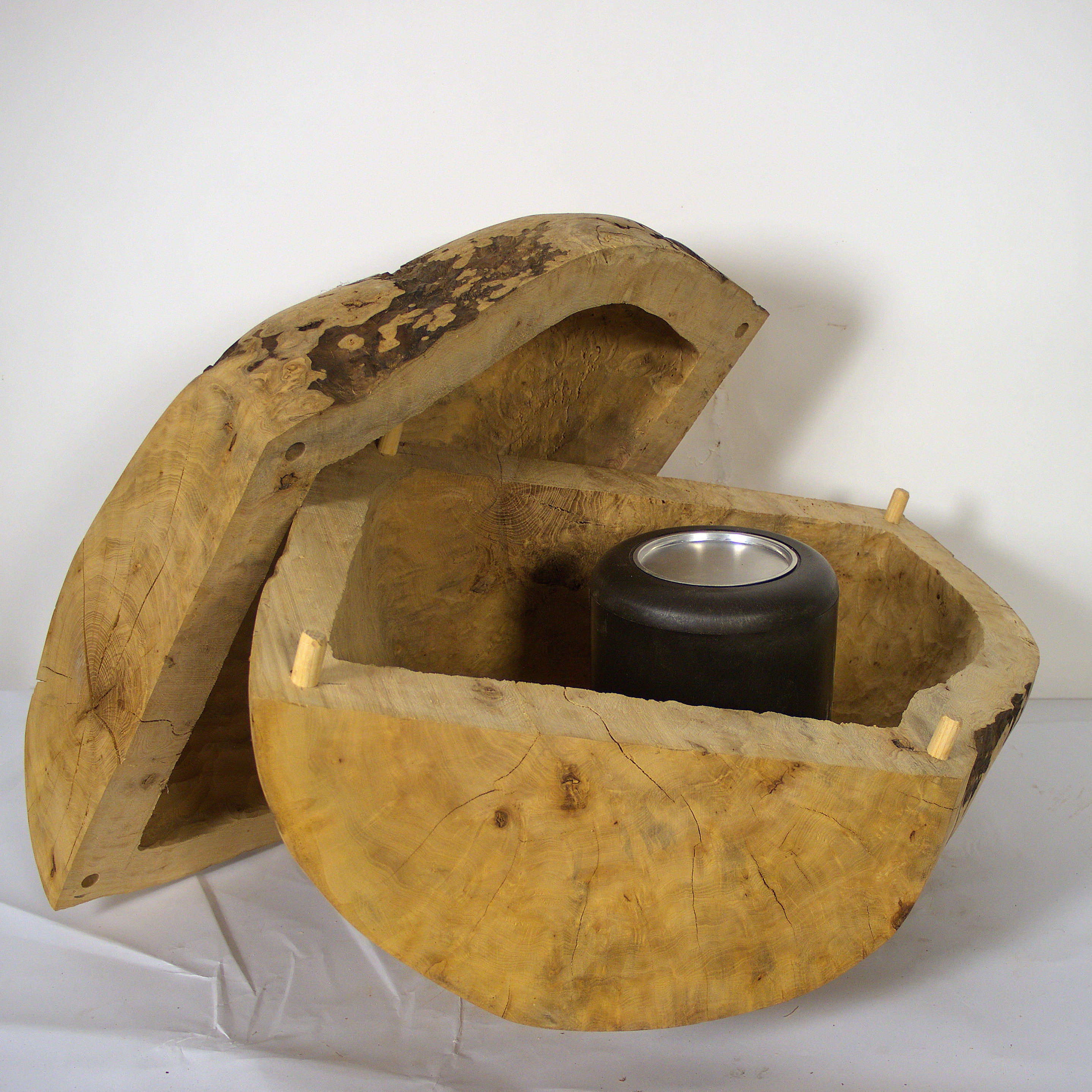 Aus der Knolle einer Eschen Maser habe ich diese hohle Form gearbeitet. Die Holzoberfläche ist gewachst. Sie kann zum Aufbewahren einer Urnenkapsel verwendet werden. Die Form ist für mich auch eine Skulptur, die zum Aufbewahren dienen kann. Die Maße: 53 x 47 x38 cm.