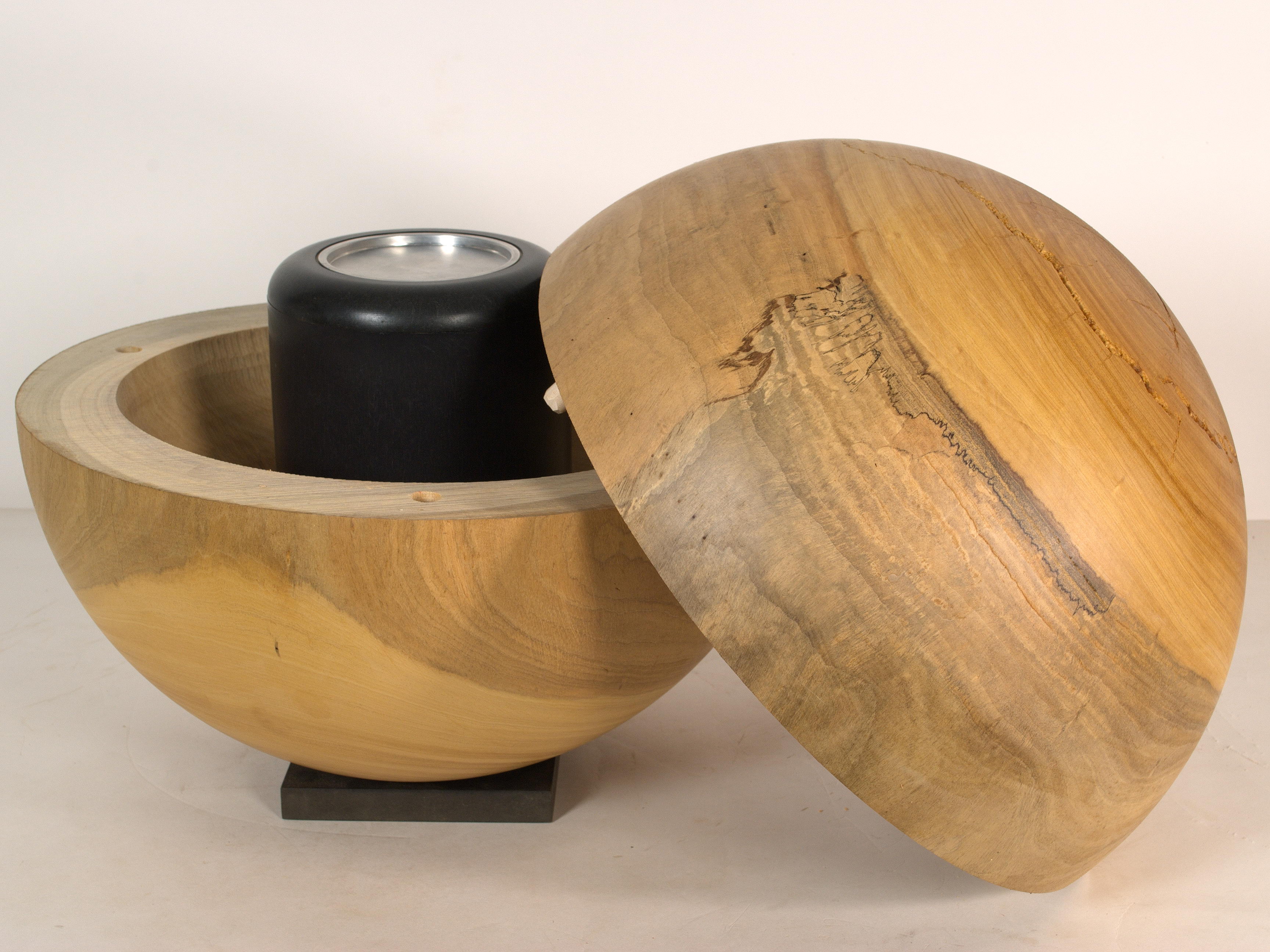 | Urnenkapsel: | Die Schmuckurnen höhle ich aus, damit eine Urnenkapsel in der Länge von 24 cm und einem Durchmesser von 17,5 cm hineingelegt werden kann. Wenn es der Platz erlaubt, sind die Aussparungen etwas größer, damit z.B. auch Platz für ein Stück Stoff ist. |